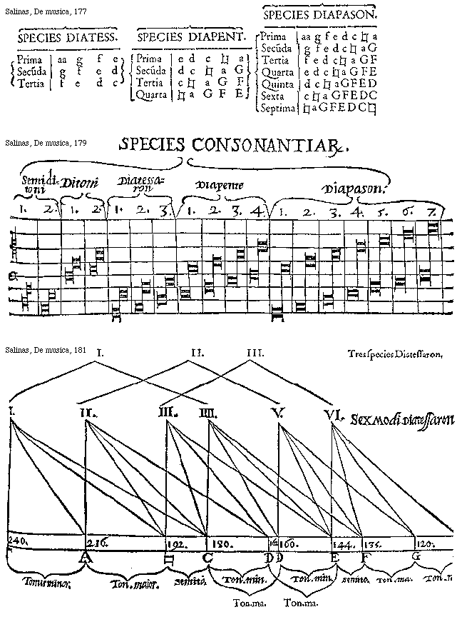 [Salinas, De musica, 177; text: SPECIES DIATESSARON. Prima aa g f e, Secunda g f e d, Tertia f e d c, SPECIES DIAPENTE. Prima e d c [sqb] a, Secunda d c [sqb] a G, Tertia c [sqb] a G F, Quarta [sqb] a G F E, SPECIES DIAPASON. Prima aa g f e d c [sqb] a, Secunda g f e d c [sqb] a G, Terita f e d c [sqb] a G F, Quarta e d c [sqb] a G F E, Quinta d c [sqb] a G F E D, Sexta c [sqb] a G F E D C, Septima [sqb] a G F E D C [sqb]]