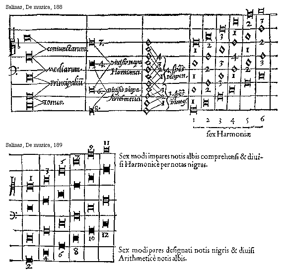 Source:Francisci Salinae Burgensis Abbatis Sancti Pancratii de Rocca Scalegna in regno Neapolitano, et in Academia Salmanticensi Musicae Professoris, de Musica libri Septem, in quibus eius doctrinae veritas tam quae ad Harmoniam, quam quae ad Rhythmum pertinet, iuxta sensus ac rationis iudicium ostenditur, et demonstratur (Salamanca: Mathias Gastius, 1577), 176–234.
