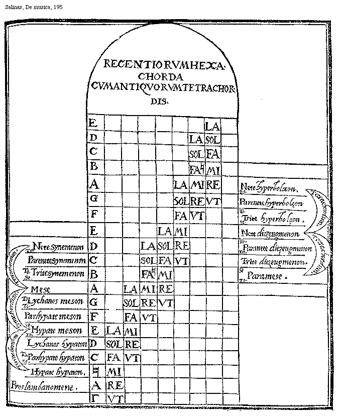 [195][Salinas, De musica, 195; text: RECENTIORVM HEXACHORDA CVM ANTIQVORVM TETRACHRODIS. Tetrachordum. Tonus, Semitonium, Nete synemenon, Paranete synemenon, Trite synemenon, Mese, Lychanos meson, Parhypate meson, Hypate meson, Lychanos hypaton, Parhypate hypaton, Hypate hypaton. Proslambanomene, [Gamma] VT, A RE, [sqb] MI, C FA VT, D SOL RE, E LA MI, F FA VT, G SOL RE VT, A LA MI RE, B FA[sqb] MI, C SOL FA VT, D LA SOL RE, C SOL FA, D LA SOL, E LA, Nete hyperbolaeon. Paranete hyperbolaeon, Trite hyperbolaeon. Nete diezeugmenon, Paranete diezeugmenon, Trite diezeugmenon. Paramese.]