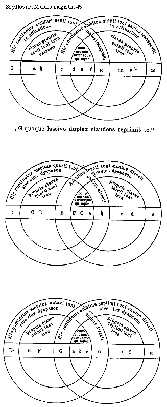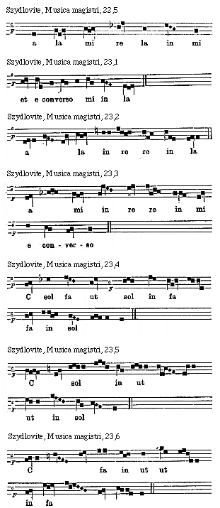 [Szydlovite, Musica magistri, 15; text: Pollex, Index, Medius, Fidius, Auricularis, [Gamma] ut, hic incipitur primus cantus h duralis caput, A re venter, h mi, per quem canitur prima coniuncta, e la mi, per quem b canitur fa loco mi sexta coniuncta, f fa ut, per quem canitur h inter mi loco fa septima coniuncta, g sol re ut, tercius cantus h duralis, C fa ut, hic primus cantus naturalis, d la sol re, caput, dd la sol, collum, aa la mi re, per quem canitur b inter fa loco mi octava coniuncta, venter, D sol re, c sol fa ut, per quem canitur h mi loco fa quinta coniuncta, cc sol fa, bb fa, hh mi, E la mi, per quem b canitur fa loco mi secunda coniuncta, b fa h mi, a la mi re, per quem canitur b fa loco mi quarta coniuncta, G sol re ut secundus h duralis, F fa ut, hic incipitur primus cantus b mollis, per quem canitur h contra mi loco fa tercia coniuncta]