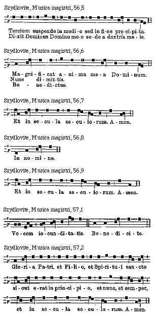 [72][Szydlovite, Musica magistri, 72; text: V. VI. VII. VIII. Circa quintum tonum notandum, quod ille est triplex: moderatus: acutus sed inusitatus: gravis et usitatus: Evovae. Circa sextum tonum sciendum quod ille est duplex: simplex: compositus: Circa septimum tonum sciendum, quod ille est triplex: acutus est duplex: gravis eciam est duplex: moderatus, qui sic canitur: Circa octavum tonum et ultimum est sciendum, quod ille eciam est triplex: moderatus est triplex: acutus: gravis, ille sic decanitur: simplus: duplus: triplus:]