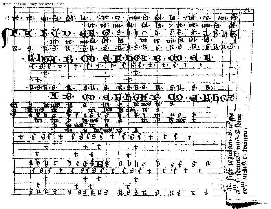 [f.23r][Oxford, Bodleian Library, Bodley 842, f.23r; text: :ut. re. mi. fa. sol. la. [Gamma]. A. B. C. D. E. F. G. a. b. [sqb]. c. d. e. f. g. A. B. H. C. R. S. .[lgs]. [sts]. t. tri pro de nos te a, a, x, b, c, d, e, f, r, g, h, i, k, l, m, n, o, p, .R. signat regulam. .S. vero spacium, [lgs] semitonium minus. [sts] semitonium maius. t. tonum.]