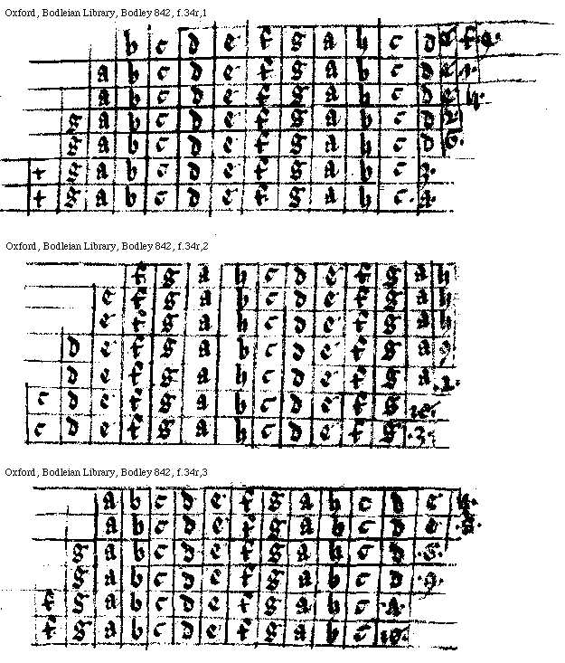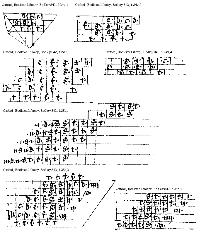 [Oxford, Bodleian Library, Bodley 842, f.25r,2; text: t. s. f. g. a. [sqb]. b. c. d. e. i. .ij. .iji. ijij .v.]