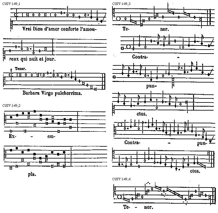 [CSIV:149,1; text: Vrai Dieu d'amer conforte l'amoureux qui nuit et jour. Tenor. Barbara Virgo pulcherrima.]