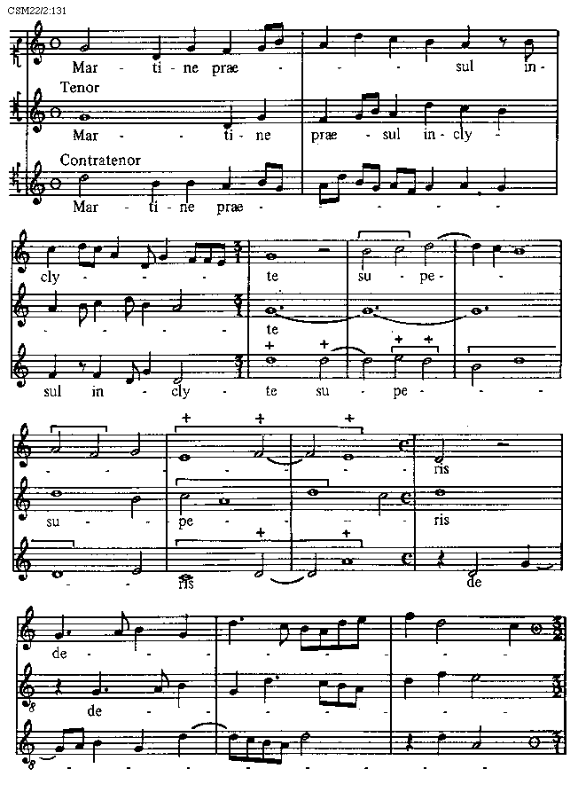 [CSM22/2:139,1; text: Petrus de Domarto, Contratenor altus, Contratenor bassus, etc.]
