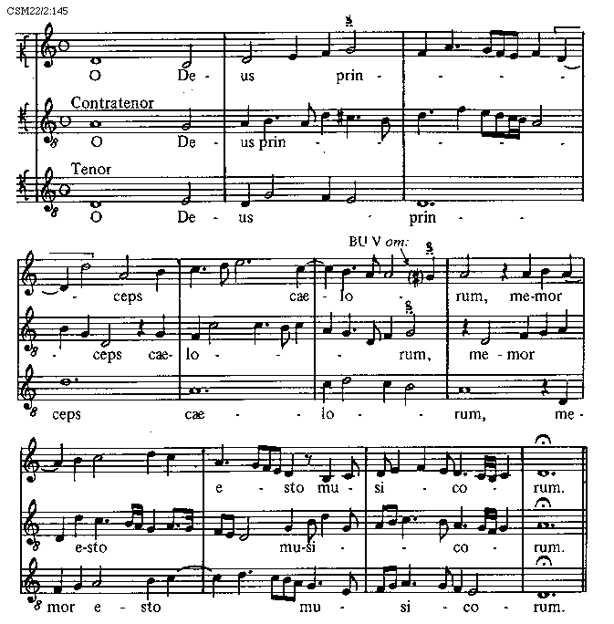 [145][CSM22/2:145; text: Tenor, Contratenor, O Deus princeps caelorum, memor esto musicorum.]