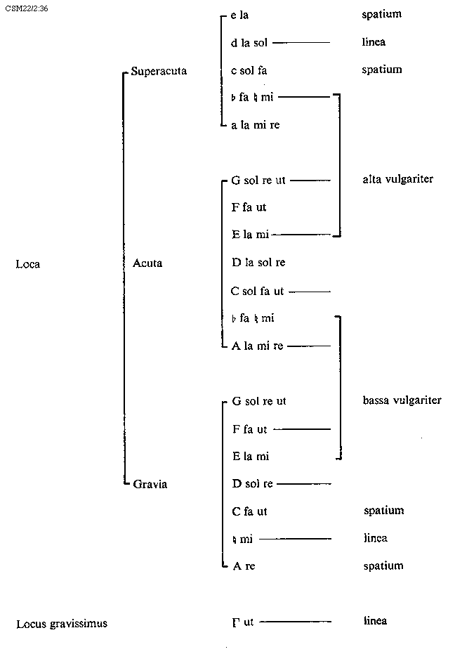 [36][CSM22/2:36; text: Loca, Superacuta, Acuta, Gravia, e la, d la sol, c sol fa, [rob] fa [sqb] mi, a la mi re, G sol re ut, F fa ut, E la mi, D la sol re, C sol fa ut, A la mi re, D sol re, C fa ut, [sqb] mi, A re, spatium, linea, alta vulgariter, bassa vulgariter, Locus gravissimus, [Gamma] ut]