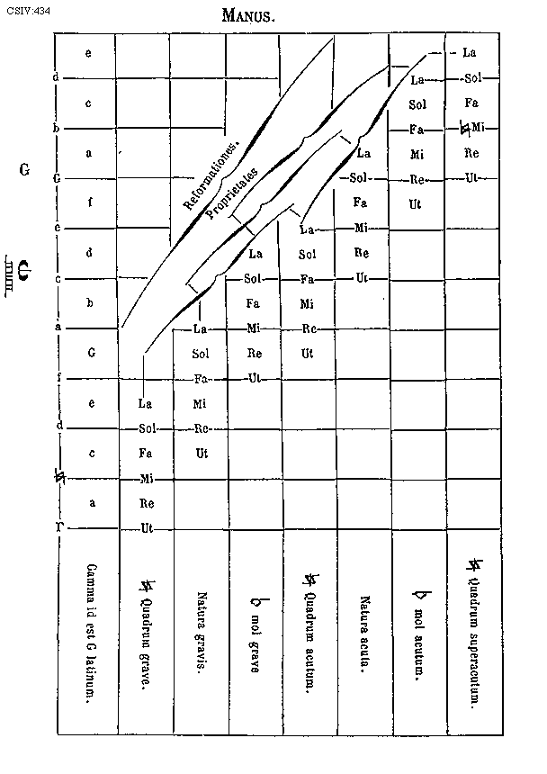 [CSIV:434; text: Manus. Reformationes. Proprietates, Gamma id est G latinum. [Gamma], a, [sqb], c, d, e, f, G, b, [sqb] Quadrum grave. Ut, Re, Mi, Fa, Sol, La, Natura gravis. [rob] mol grave, [sqb] Quadrum acutum. Natura acuta. [rob] mol acutum. [sqb] Quadrum superacutum. [sqb] Mi]