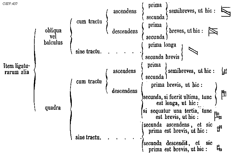 [CSIV:437; text: Item ligaturarum alia, obliqua vel balculus, cum tractu, ascendens, prima, secunda, semibreves, ut hic, descendens, prima, secunda, breves, sine tractu, prima longa, secunda brevis, quadra, prima brevis, secunda, si fuerit ultima, tunc est longa, si sequatur una tertia, tunc est brevis, secunda ascendens, et sic prima est brevis, secunda descendit, et sic prima est brevis]