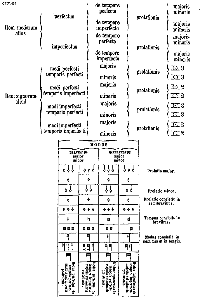 [439][CSIV:439; text: Item modorum alius, perfectus, de tempore perfecto, de tempore imperfecto, prolationis, majoris, minoris, imperfectus, Item signorum aliud, modi perfecti temporis perfecti, modi perfecti temporis imperfecti, modi imperfecti temporis perfecti, modi imperfecti temporis imperfecti, Modus, Perfectus, major, minor, Imperfectus, Prolatio major. Prolatio minor. Prolatio consistit in semibrevibus. Tempus consistit in brevibus. Modus consistit in maximis et in longis. Modus perfectus de tempore perfecto majoris aut minoris prolationis. Modus perfectus de tempore imperfecto majoris aut minoris prolationis. Modus imperfectus de tempore perfecto majoris aut minoris prolationis. Modus imperfectus de tempore imperfecto majoris vel minoris prolationis.]