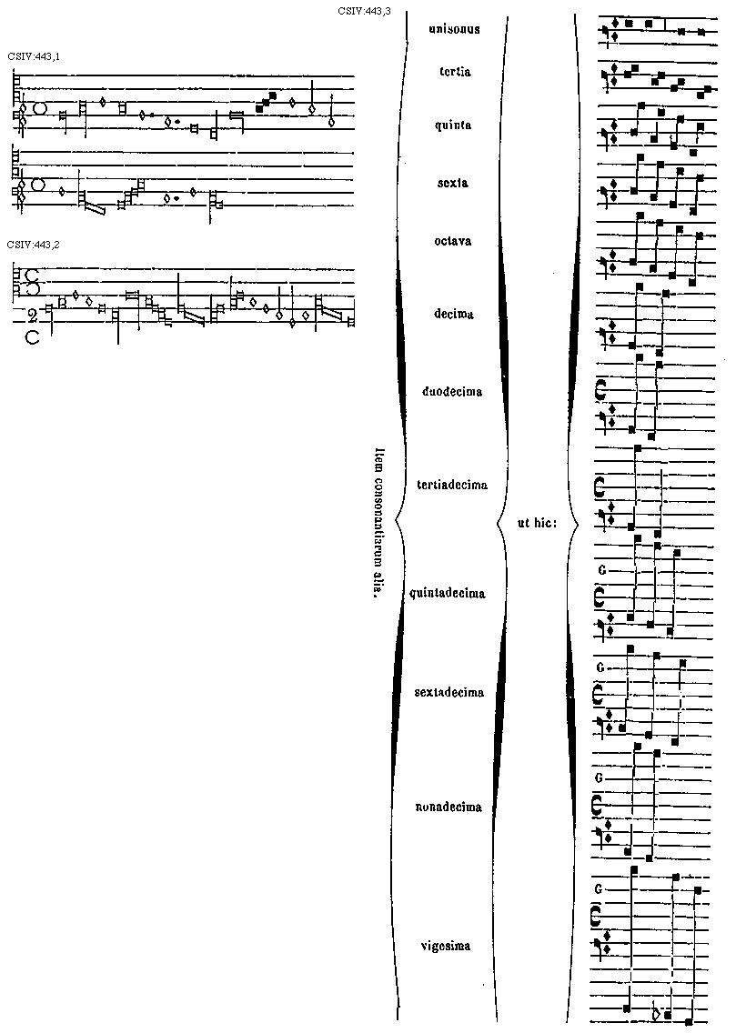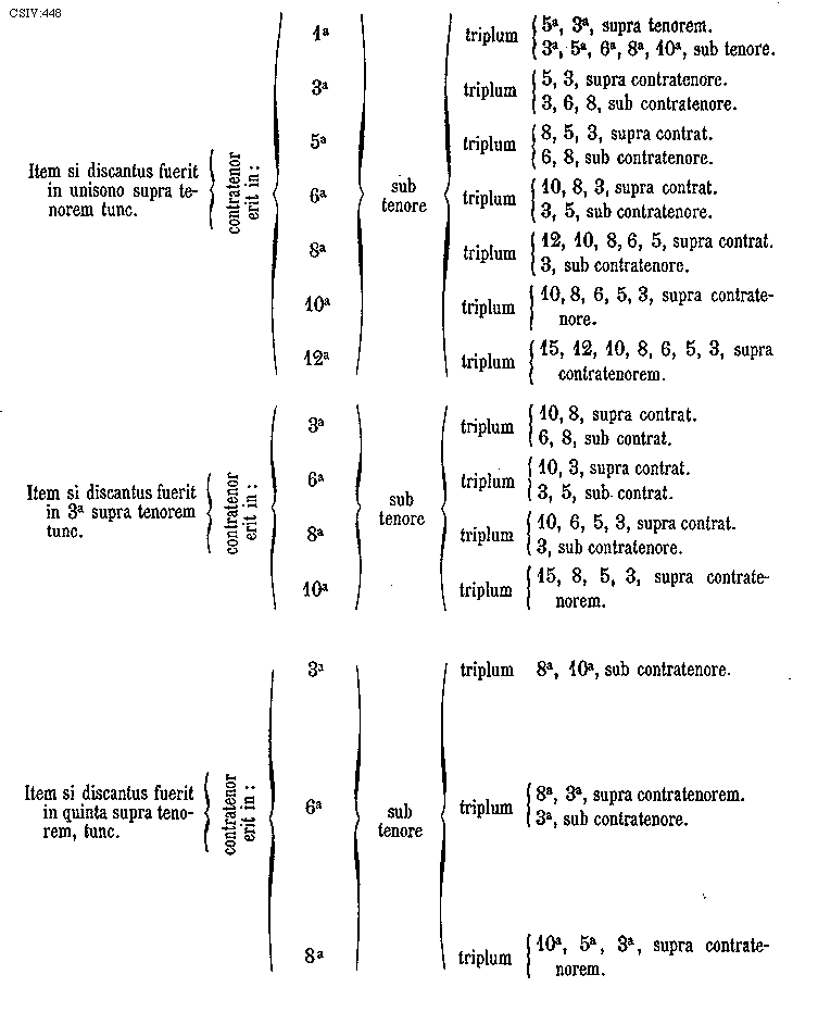 [448][CSIV:448; text: Item si discantus fuerit in unisono supra tenorem tunc. contratenor erit in: 1a, 3a, 5a, 6a, 8a, 10a, 12a, sub tenore, triplum, 5a, 3a, supra tenorem. 3a, 5a, 6a, 8a, 10a, sub tenore. 5, 3, supra contratenore. 3, 6, 8, sub contratenore. 8, 5, 3, supra contratenore. 6, 8, sub contratenore. 10, 8, 3, supra contratenore. 3, 5, sub contratenore. 12, 10, 8, 6, 5, supra contratenore. 3, sub contratenore. 10, 8, ,6, ,5, ,3, supra contratenore. 15, 12, 10, 8, 6, 5, 3, supra contratenorem. Item si discantus fuerit in 3a supra tenorem tunc. 10, 8, supra contratenorem. 6, 8, sub contratratenore. 10, 3, supra contratenorem. 3, 5, sub contratenore. 10, 6, 5, 3, supra contratenorem. 3, sub contratenore. 15, 8, 5, 3, supra contratenorem. Item si discantus fuerit in quinta supra tenorem, tunc. 8a, 10a, sub contratenore. 8a, 3a, supra contratenorem. 3a, sub contratenore. 10a, 5a, 3a, supra contratenorem.]