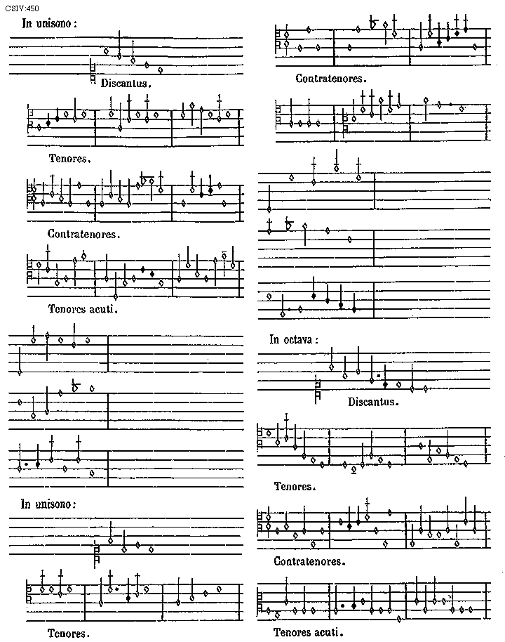 [450][CSIV:450; text: In unisono: Discantus. Tenores. Contratenores. Tenores acuti. In octava]