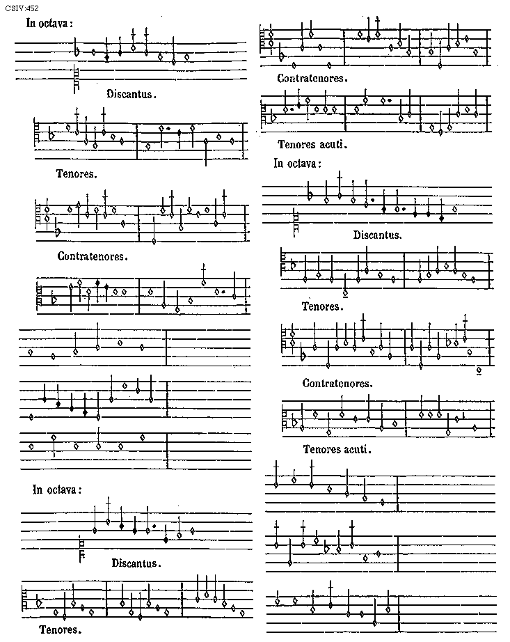 [452][CSIV:452; text: In octava: Discantus. Tenores. Contratenores. Tenores acuti.]