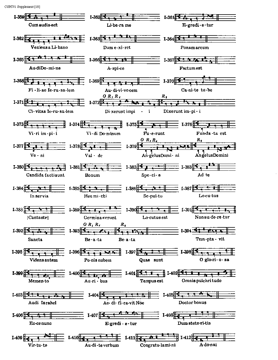 [CSM7/1 Supplement:[17]; text: Dominus in templo, Magnus sanctus Paulus, Seculorum amen, Euntes ibant, Cum venerit, Summa ingenuitas, Hoc est praeceptum meum, Martyrum chorus, Aquae multae, Dixit angelus ad Petrum, Nos qui vivimus, Dulcis sonus est primus, differentiis octo formatus, Solus est secundus hac sola sic terminatus, Levatur tertius aspere quater mutatus in fine, Dulcis modus est quartus quaterno fine refertus, Quintus ad alta salit uno tantum fine contentus, Sextus cum primo sonans unica differentia finit, Septimus ex sex formis seculorum est locandus, Octavus ex tribus differentiis est intonandus, Tradiderunt, In omnibus, In principio, Offerentur, Felix namque, Factum est, Iustus, Angelis suis, Posui adiutorium, Propter testamentum Domini, Quare detraxistis, Domine ne in ira tua, Sint lumbi, Circumdederunt, Duo seraphin, Quam dilecta, Nativitas gloriosae, Nativitas tua, In dedicatione, I-326, I-327, I-328, I-329, I-330, I-331, I-332, I-333, I-334, I-335, I-336, I-337, I-338, I-339, I-340, I-341, I-342, I-343, I-344, I-345, I-346, I-347, I-348, I-349, I-350, I-351, I-352, I-353, I-354, I-355, I-356, I-357, I-358]