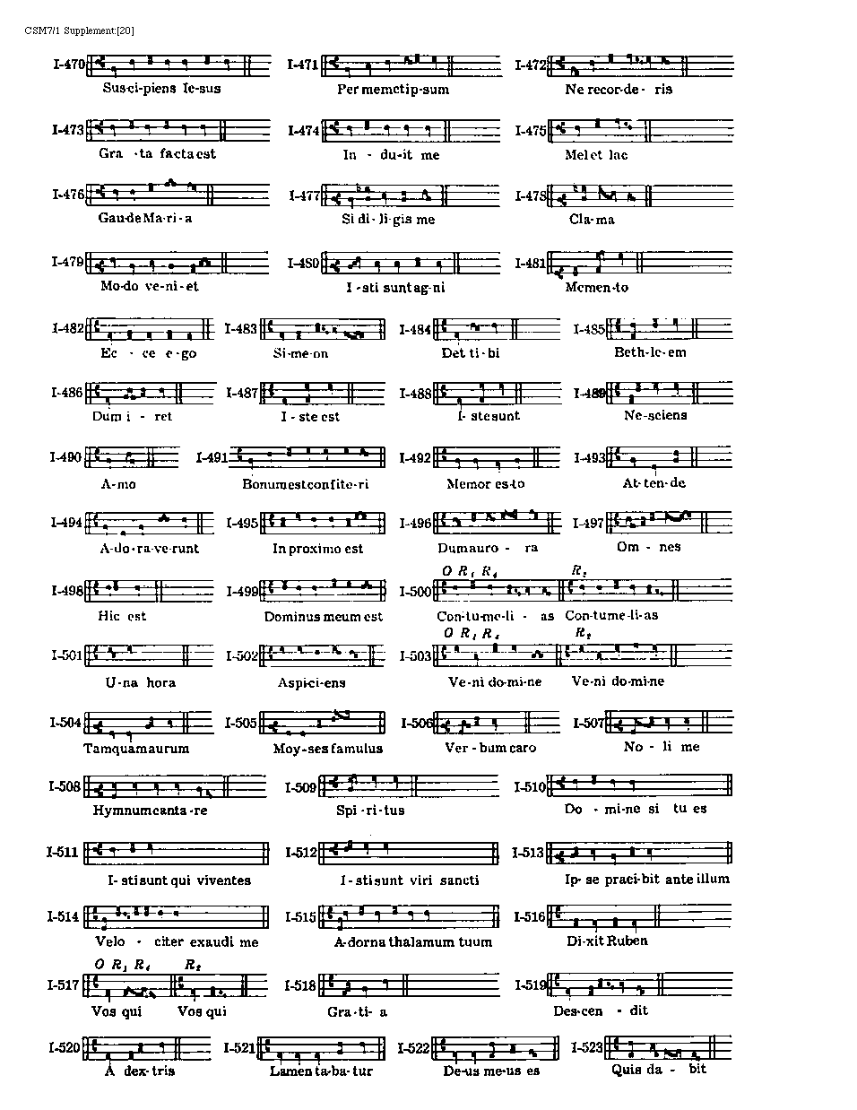 [CSM7/1 Supplement:[20]; text: Suscipiens Iesus, Per memetipsum, Ne recorderis, Grata facta est, Induit me, Mel et lac, Gaude Maria, Si diligis me, Clama, Modo veniet, Isti sunt agni, Memento, Ecce ego, Simeon, Det tibi, Bethleem, Dum iret, Iste est, Iste sunt, Nesciens, Amo, Bonum est confiteri, Memor esto, Attende, Adoraverunt, In proximo est, Dum aurora, Omnes, Hic est, Dominus meum est, Contumelias, Una hora, Aspiciens, Veni domine, Tamquam aurum, Moyses famulus, Verbum caro, Noli me, Hymnum cantare, Spiritus, Domine si tu es, Isti sunt qui viventes, Isti sunt viri sancti, Ipse praeibit ante illum, Velociter exaudi me, Adorna thalamum tuum, Dixit Ruben, Vos qui, Gratia, Descendit, A dextris, Lamentabatur, Deus meus es, Quis dabit, I-470, I-471, I-472, I-473, I-474, I-475, I-476, I-477, I-478, I-479, I-480, I-481, I-482, I-483, I-484, I-485, I-486, I-487, I-488, I-489, I-490, I-491, I-492, I-493, I-494, I-495, I-496, I-497, I-498, I-499, I-500, I-501, I-502, I-503, I-504, I-505, I-506, I-507, I-508, I-509, I-510, I-511, I-512, I-513, I-514, I-515, I-516, I-517, I-518, I-519, I-520, I-521, I-522, I-523]