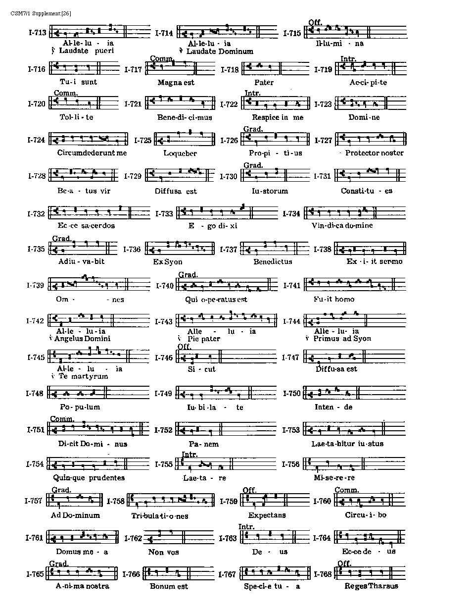 [CSM7/1 Supplement:[26]; text: Alleluia Versus Laudate pueri, Alleluia Versus Laudate Dominum, Offertorium, Illumina, Tui sunt, Communio, Magna est, Pater, Introitus, Accipite, Tolite, Benedicimus, Respice in me, Domine, Circumdederunt me, Loqueber, Graduale, Propitius, Protector noster, Beatus vir, Diffusa est, Iustorum, Constitues, Ecce sacerdos, Ego dixi, Vindica domine, Adiuvabit, Ex Syon, Benedictus, Exiit sermo, Omnes, Qui operatus est, Fuit homo, Alleluia Versus Angelus Domini, Alleluia Versus Pie Pater, Alleluia Versus Primus ad Syon, Alleluia Versus Te martyrum, Sicut, Diffusa est, Populum, Iubilate, Intende, Dicit Dominus, Panem, Laetabitur iustus, Quinque prudentes, Laetare, Miserere, Ad Dominum, Tribulationes, Expectans, Circuibo, Domus mea, Non vos, Deus, Ecce deus, Anima nostra, Bonum est, Specie tua, Reges Tharsus, I-713, I-714, I-715, I-716, I-717, I-718, I-719, I-720, I-721, I-722, I-723, I-724, I-725, I-726, I-727, I-728, I-729, I-730, I-731, I-732, I-733, I-734, I-735, I-736, I-737, I-738, I-739, I-740, I-741, I-742, I-743, I-744, I-745, I-746, I-747, I-748, I-749, I-750, I-751, I-752, I-753, I-754, I-755, I-756, I-757, I-758, I-759, I-760, I-761, I-762, I-763, I-764, I-765, I-766, I-767, I-768]