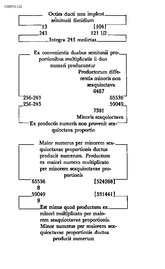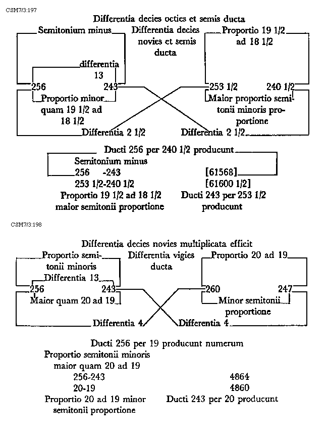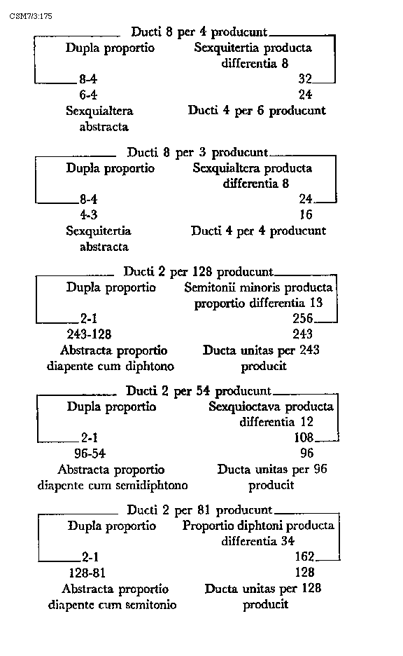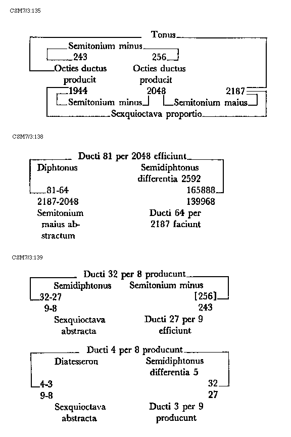 Item tonus sua secundaria divisione dividitur in duo semitonia minora et coma, in numeris autem in bis sex et unitatem. Item tonus tertia sui divisione dividitur vel est divisibilis in quatuor diaschismata et coma. Patet hoc quia tonus est divisibilis in duo semitonia minora et coma. Sed quodlibet semitonium minus dividitur vel est divisibile in duo diaschismata. Semitonium vero maius in duo diaschismata et duo schismata, igitur tonus sui tertia divisione dividitur vel est divisibilis in quatuor