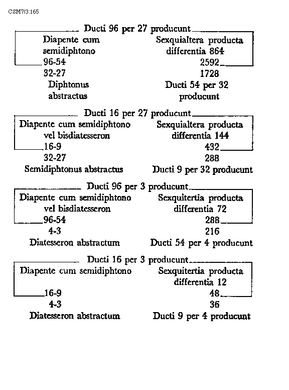 [217]diaschismata et coma. In numeris autem dividitur tonus in quater tria et unitatem sive duas unitatis medietates. Patet hoc quia quod quodlibet diaschisma cum sit medium dieseos sive semitonii minoris valet tres unitates. Coma vero duo valet schismata, quorum quodlibet unitatis medietatem tenet. Hac igitur tertia divisione divisibilis est tonus in quatuor diaschismata valentia 12 unitates et duo schismata valentia unam unitatem sive unius unitatis duas medietates. Semitonium minus vel diesis dividitur vel est divisibile in duo diaschismata. In numeris autem semitonium minus in bis tres dividitur unitates. Semitonium maius sive apotome dividitur vel est divisibile in duo diaschismata et duo schismata. In numeris autem est divisibile semitonium maius in bis tres unitates quoad duo diaschismata et duas unius unitatis medietates quoad duo schismata, quorum quodlibet unitatis dimidium valet. Integrum dimidium toni proprie dividitur vel est divisibile in duo diaschismata et unum schisma. In numeris autem in bis tres unitates et unitatis dimidium quod tenet schisma.