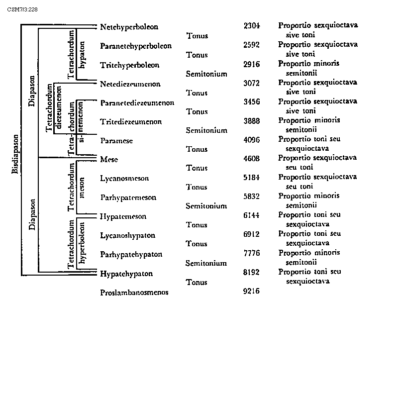 Toni et semitonia haec in manu comprehensi et si ex se pateant intelligenti, tamen ex suis numeris clarissime demonstrantur. Nam ipsi numeri positi sunt ad cordas seu voces ut earum ad invicem proportiones significent, sumptique sunt secundum divisionem et additionem partium divisionis. Sicut enim duae immediatae voces semitonium minus vel tonum efficiunt, sic duo immediati numeri earum vocum quarum sunt numeri proportiones ostendunt, et quoniam inter immediatas voces vel est tonus vel semitonium, ideo inter immediatos numeros vel est toni vel semitonii minoris proportio. Patet hoc in primarum numeris vocum, scilicet, 9216 et 8192, qui quoniam in sexquioctava proportione se habent, quae est proportio toni. Ideo inter proslambanosmenos et hypatehypaton dicitur esse tonus, et quod hi numeri sint in proportione sexquioctava patet,