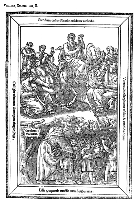 [IIr][Vanneo, Recanetum, IIr; text: Pieridum custos Phoebo residente cathedra. Vanneus hic Stephanus uiolas et candida donat. Lilia: purpureis cunctis cum floribus una. Colligite o iuuenes et tempora cingite sertis.]