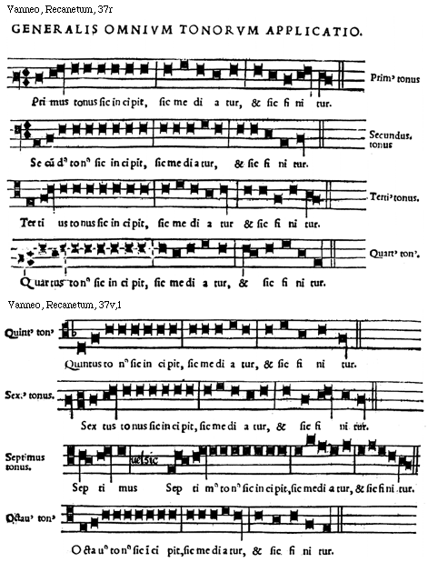 [Primus tonus quibus speciebus constet. in marg.] Primum igitur tonum, neminem uel mediocriter eruditum ignorare puto, prima Diapente specie Re la, et Prima Diatessaron specie Re sol, constare. [Primi toni cadentiae quot et quae. in marg.] Laboranti ergo in huiusmodi toni compositione, in omnibus cantilenae partibus, et in Tenore praesertim, quum sit totius Cantilenae Bassis, ac fundamentum, uagari non licebit extra huius toni supra dictas species, sed intra illarum metas continendum erit, quod si secus feceris, tua erit Cantilena dissona, ac sine Venere, penitusque explodenda, praesertim si Tenor suas desiderauerit Cadentias, quae numero sex sunt Videlicet, C, fa ut, D sol re, F fa ut, G sol re ut, A la mi re, et D la sol re, et has easdem suis in Octauis inuenies, huic utique tono apprime gratas. [Secundi toni species. in marg.] Secundus tonus, instar Primi, eodem et Diapente et Diatessaron potitur, hic tamen ab illo differt dispositione Diatessaron. Nam Primus tonus Diatessaron supra Diapente dispositum habet, hic uero infra Diapente. Caueas igitur ne alterius toni species huic inseras, nisi chimaeram construere cupias. [Secundi toni cadentiae. in marg.] Proprias insuper huius Cadentias sex esse non ignoras, A re, C fa ut, D sol re, F fa ut, G sol re ut, et A la mi re, harumque in Octauis tonus iste Cadentias amat. [Tertii toni species. in marg] Tertii toni compositionem, secunda Diapente species Mi mi, Secundaque Diatessaron species Mi la tibi pariunt, aliae uero penitus alienae sunt, nec faciunt ad rem. [Tertii toni cadentiae. in marg.] Cadentiae autem huic eidem tono propriae ac naturales sex habentur, E la mi, F fa ut, G sol re ut, A la mi re, B fa [sqb] mi, et C sol fa ut, et reliquae quas harum pariunt Octauae. [Quarti toni species. Quarti toni cadentiae. in marg.] Quartus tonus, nisi suum et Diapente et Diatessaron secundum habuerit Mi mi, et La mi, erit auribus insuauis, at seruatis supradictis iugi contextu speciebus, cum suis sex cadentiis, C fa ut, D sol re, E la mi, F fa ut, G sol re ut, et A la mi re, subintellectis harum Octauis, erit omni nectare dulcior. [Quinti toni species. in marg.] Quinto item tono, Diapente et Diatessaron Tertiae speciei uidelicet, Fa fa, et Vt fa congruunt, et non aliae. [Quinti toni cadentiae. in marg.] Cadentiae uero propriae Quattuor sunt uidelicet, F fa ut, G sol re ut, A la mi re, et C sol fa ut, et quae suis in Octauis reperiuntur. [Sexti toni species. Sexti toni cadentiae. in marg.] Sextus autem tonus, easdem habere debet species, quas Quinto attribuimus uidelicet, Fa fa, et Fa ut. Quinque deinde Cadentiis gaudet, C fa ut, D sol re, F fa ut, A la mi re, et C sol fa ut, idem de suis intelligas Octauis. [Septimi toni species. Septimi toni cadentiae. in marg.] Septimus deinde tonus, Diapente quartae tantum speciei Vt sol, et primae speciei Diatessaron Re sol, usurpat, egressus autem harum metas, comtemptui omnibus erit, multoque magis a suis quinque amotus Cadentiis uidelicet, G sol re ut, A la mi re, B fa [sqb] mi, C sol fa ut, et D la sol re, harumque octauis. [Octaui toni species. Octaui toni cadentiae. in marg.] Octauus denique tonus, Septimi toni speciebus fruitur uidelicet, Vt sol, et sol re, suis subeuntibus Cadentiis, quae numero quattuor sunt, D sol re, Fa fa ut, G sol re ut, et C sol fa ut, et totidem harum habent Octauae. Conaberis igitur pro uirili tua, singulis iam praemissis tonis non alias afferre et Diatessaron et Diapente species, et Cadentias nisi eas tantum, quas attribuendas praecepimus inuiolabiliter, nec extra illas in uniuerso Cantilenae context uagandum erit, ut imperiti ac penitus huius artis ignari solent, suis ineptiis iactabundi, qui rebus suis rectius consulerent, si Doctiores audirent.
