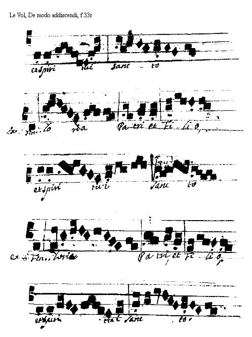 [f.32r][Le Vol, De modo addiscendi, f.32r; text: Exemplum Primi Toni. Finalis. Gloria Parti et Filio et Spiritui Sancto [[Sanc]], Secundi, Tertii]