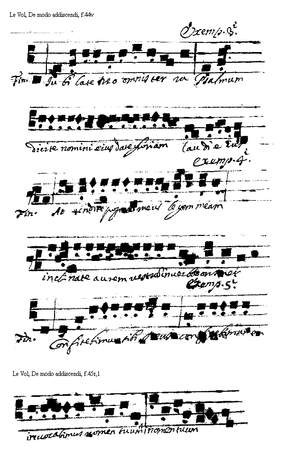 [f.44v][Le Vol, De modo addiscendi, f.44v; text: Exemplum Tertii. Finalis. Iubilate omnis terra Psalmum dicite nomini eius date gloriam laudi eius. Quarti. Attendite popule meus legem meam inclinate aurem uestrum in uerba oris mei Quinti. Confitebimur tibi Deus et]