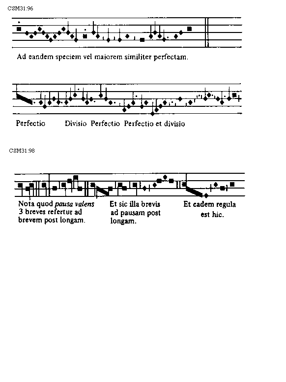 [CSM31:98; text: Nota quod pausa valens 3 breves refertur ad brevem post longam. Et sic illa brevis ad pausam post longam. Et eadem regula est hic.]