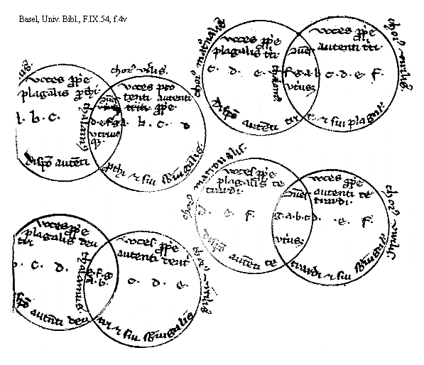 [f.4v][Basel, Univ. Bibl., F.IX.54, f.4v; text: chorus matronalis. chorus virilis. voces proprie plagalis prothi. voces protenti autenti [[triti]] proprie. a. b. c. d. e. f. g. [sqb]. comunes [[vtriusque]] vtriusque. disposicio autenti, prothi et sui subiugalis. voces proprie plagalis deutri, voces proprie autenti deutri, thalamus. disposicio autenti deutri et eius subiugalis. voces proprie plagalis triti. voces proprie autenti triti. disposicio autenti triti et sui plagalis. voces proprie plagalis tetrardi. voces proprie autenti tetrardi. disposicio autenti tetrardi et sui subiugalis.]