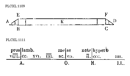 [PLCXL:1111; text: proslambanomenos, mese, nete hyperboleon, A. O. H. LL. VIII[macron supra lin.]. CC. XVI. IIII[macron supra lin.]. DC. VII. II[macron supra lin.]. CCC. IIII.]