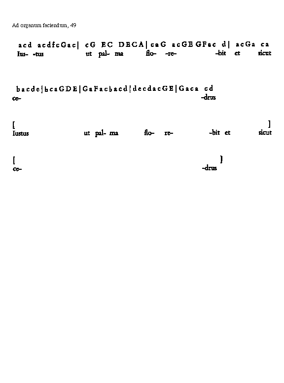 [49][Ad organum faciendum, 49; text: a, b, [sqb], c, d, e, f, A, C, D, E, F, G, Iustus ut palma florebit et sicut cedrus]