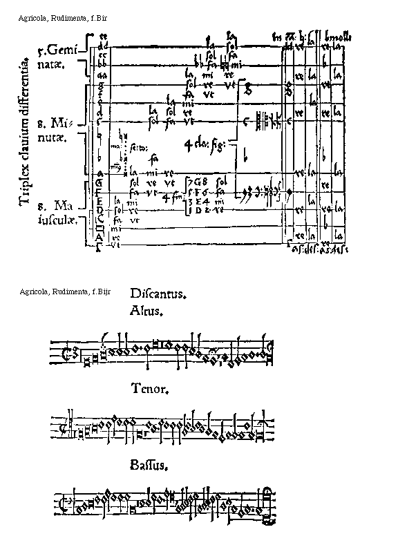 [f.Bir][Agricola, Rudimenta, f.Bir; text: Triplex clauium differentia. 5. Geminatae. 8. Minutae. 8. Maiusculae. [Gamma], A, [sqb], C, D, E, F, G, a, [rob], [sqb], c, d, e, f, g, aa, bb, cc, dd, ee, vt, re, mi, fa, sol, la, maior semitonium, minor, 4 claves signatae, 4 finales, b molle, 1, 2, 3, 4, 5, 6, 7, 8, [rob][rob]fa, [sqb][sqb]mi, ascendendo, descendendo, in causa]