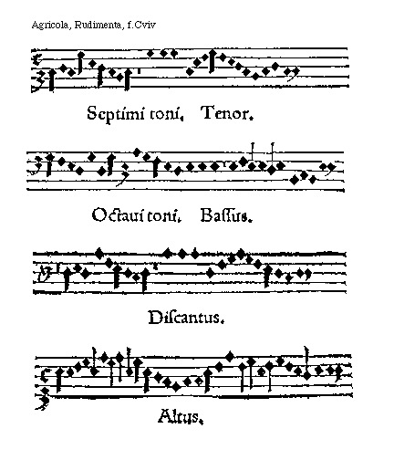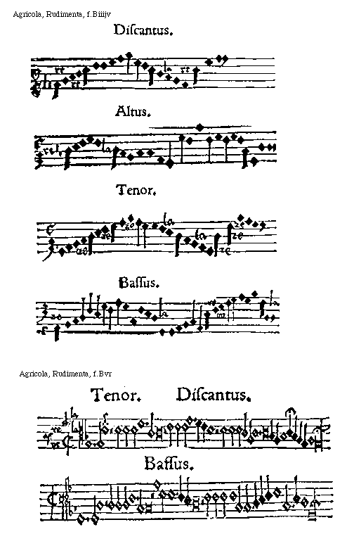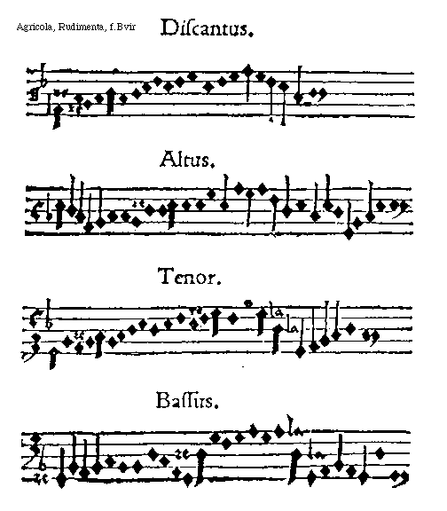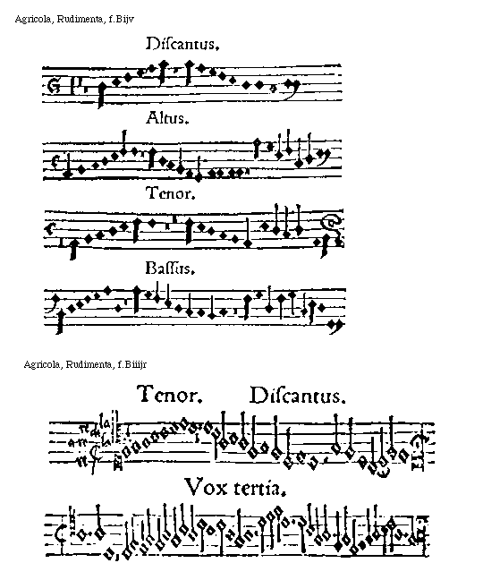 [Agricola, Rudimenta, f.Ciijv,1; text: Tenor. Discantus. Bassus. Altus. Tenor primi toni acuti.]