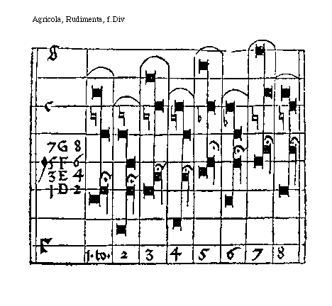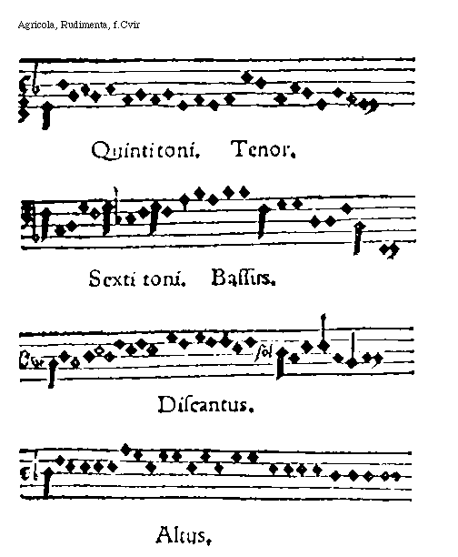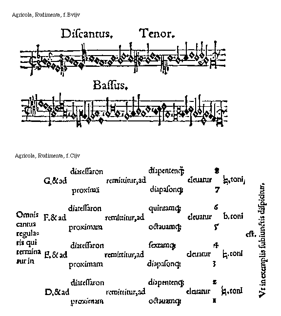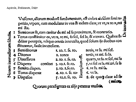 [f.Ciiijv recte f.Diiijv][Agricola, Rudimenta, f.Ciiijv recte f.Diiijv; text: Nouem interuallorum scholia. De interuallis. Vnisonus, aliorum modorum fundamentum, est crebra eiusdem soni repetitio, vtpote, cum modulatur in vna et eadem claue, vt vt, re re re, mi mi et caetera. 1, 2, 3, 4, 5, 6, 7, 8, 9, Semitonus fit, cum canitur de mi ad fa proximum, et econtrario. Tonus constituitur ex, vt re, re mi, fa sol, sol la, et econtra. Quibus fideliter perceptis, reliqua omnia interualla, quod solum ijs duobus constituantur, facile innotescent. Semiditonus, Ditonus, Diatessaron, Diapente, Semitonus diapente, Tonus diapente, Diapason, continet, 1. tonum 1. semitonium, 2. tonos, 2. tonos 1. semitonium, 3. tonos 1. semitonium, 3. tonos 2. semitonia, 4. tonos 1. semitonium, 5. tonos 2. semitonia, Exemplum est. tertia, re fa. mi sol. tertia, vt mi. fa la. quarta, vt fa. re sol. mi la, quinta, vt sol re la. mi mi. fa fa, sexta, re fa. mi fa. sexta, vt la. octaua de quaque claue ad similem. Quorum paradigmata ex alijs petantur musicis.]