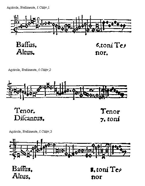 [Agricola, Rudimenta, f.Ciijr; text: Cantica tonorum, Acutorum, Grauium, Mixtorum, incipiuntur voce, Submissa, Acuta, Mediocri, quia in, altum, profundum, vtrunque, tendunt.]