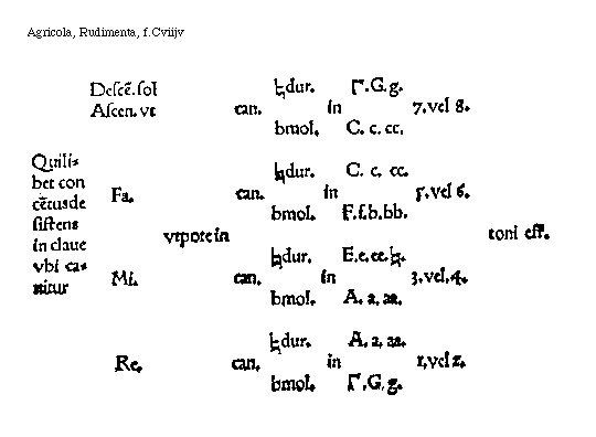 [f.Cviijv][Agricola, Rudimenta, f.Cviijv; text: Quilibet concentus desistens in claue vbi canitur, Descendendo, sol, Ascendendo, vt, Fa. Mi. Re. vtpote in, cantu, [sqb]duro, bmolle, in, [Gamma].G.g. C.c.cc. F.f.b.bb. E.e.ee.[sqb]. A.a.aa. septimi vel octaui, quinti vel sexti, tertij vel. quarti, primi vel secundi, toni est.]