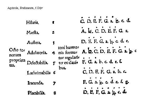 [f.Dijv][Agricola, Rudimenta, f.Dijv; text: Octo tonorum proprietates. Hilaris. Maesta. Austera. Adulatoria. Delectabilis. Lachrimabilis, Iracunda. Placabilis. 1, 2, 3, 4, 5, 6, 7, 8, toni harmonia formatur regulariter ex clauibus. A. [sqb]. C. D. E. F. G. a. c. d. e. f. g.]