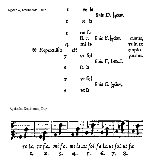 [f.Diijr][Agricola, Rudimenta, f.Diijr; text: Repercussio, 1, 2, 3, 4, 5, 6, 7, 8, est, re la, re fa, mi fa, E. c. mi la, vt sol, fa la, vt fa, finis D. [sqb]durum, finis E. [sqb]durum, finis F. bmolle, finis G. [sqb]durum, cantus, vt in exemplo patebit.]
