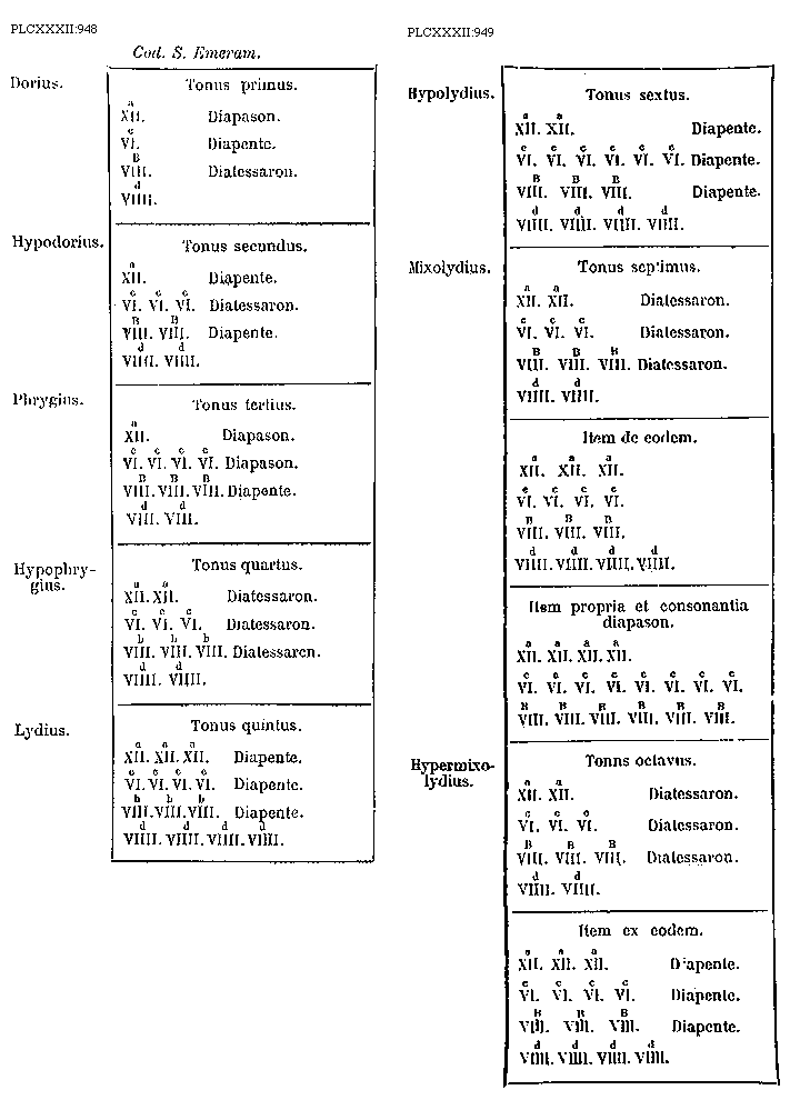 [PLCXXXII:948; text: Dorius. Hypodorius. Phrygius. Hypophrygius. Lydius. Tonus primus. Tonus secundus. Tonus tertius. Tonus quartus. Tonus quintus. Diapason. Diapente. Diatessaron. XII [a supra lin.]. VI [c supra lin.]. VIII [B supra lin.]. VIIII [d supra lin.]. VIII [b supra lin.].]