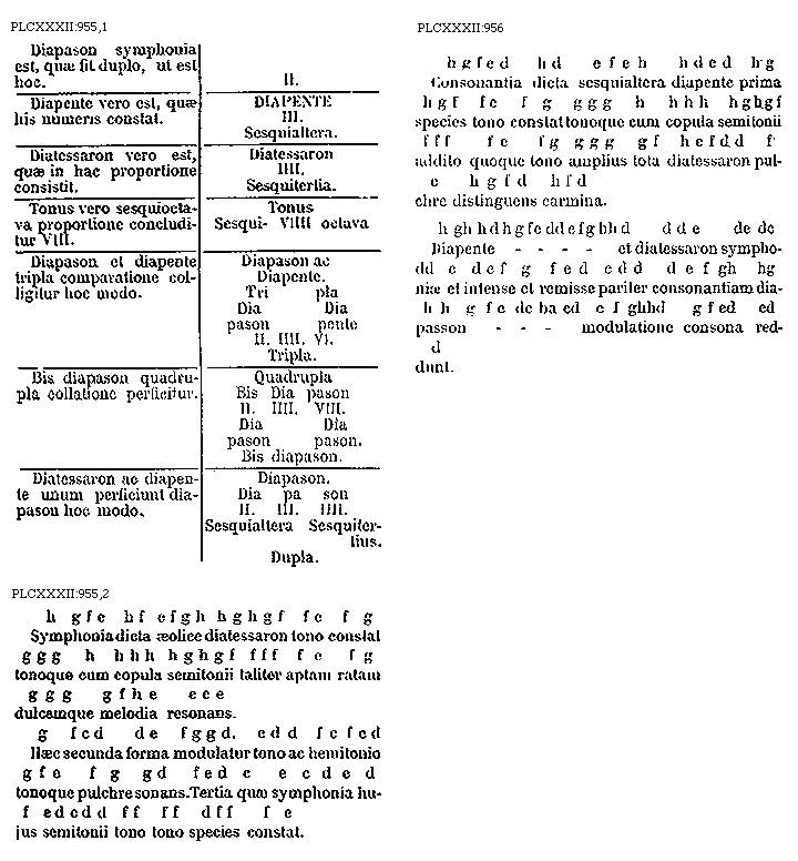 [PLCXXXII:955,1; text: Diapason symphonia est, quae fit duplo, ut est hoc. II. Diapente vero est, quae his numeris constat. DIAPENTE, III. Sesquialtera. Diatessaron vero est, quae in hac proportione consistit. Diatessaron, IIII. Sesquitertia. Tonus vero sesquioctava proportione concluditur VIII. Tonus, Sesquioctava, VIIII, Diapason et diapente tripla comparatione colligitur hoc modo. Diapason ac Diapente. Tripla, Diapason, Diapente, VI. Bis diapason quadrupla collatione perficitur. Quadrupla, Bis Diapason, VIII. Diatessaron ac diapente unum perficiunt diapason hoc modo. Sesquitertius. Dupla.]