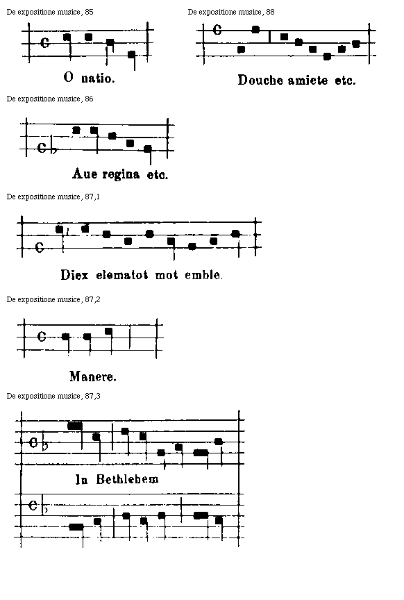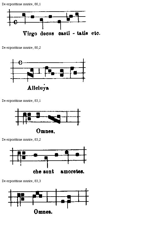 In primo igitur capitulo docet actor figurarum formas, representationes proprietatesque pariter et effectus. Et illud in duo membra diuiditur, eo quod due sunt species figurarum, quoniam omnes tales aut sunt simplices aut composite, ut patebit. Ideoque in primo membro agit de simplicibus et illud incipit ecce tibi formas et cetera, in secundo de compositis et illud ibi disce ligatarum et cetera. In secundo enim capitulo modorum species manifestat et illud incipit ibi est mensura modus et cetera. In tertio de figuris pausationum et naturis pariter dat doctrinam et illud incipit ibi hic dabo pausarum et cetera, in quarto de consonantiis huius artis dissonantias euitando et illud incipit ibi sunt bene qui pangunt et cetera. In quinto de discantu, et illud in duo membra diuiditur in quorum primo agit actor simpliciter de discantu, in secundo specialiter de copula, que est membrum ipsius discantus, nec ab eo differt nisi solummodo in figmentando; primum igitur incipit vnit discantus et cetera, secundum ibi copula cantores. In sexto et ultimo de organo speciali, quod omne genus cantuum superat dulcedine melodie et illud incipit nobis organica et cetera. Et sic patet in uniuerso libri ordinatio supradicta.