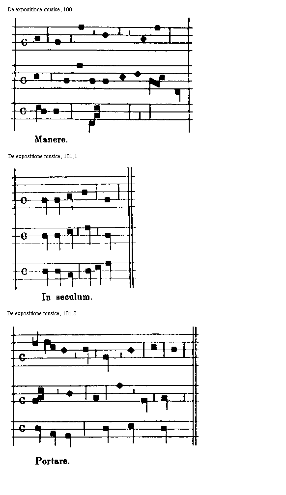 [5]duas partes diuiditur principales, scilicet in inmensurabilem et mensurabilem. Et nota, quod inmensurabilis est illa, ubi non sunt longe uel breues uel aliqua quantitas temporum sub certo numero distributa. Mensurabilis est illa, in qua sua quantitas temporum reperitur. De prima nisi proponimus in presenti, de secunda autem sumus in sussequentibus tractaturi. Cuius mensurabilis musice tria sunt genera, scilicet discantus, copula et organum. Et est aliud organum, quod idem est quod musica. Mensurabilis et prout ita sumitur est genus generale ad tria genera supradicta, de quibus per ordinem locis debitis sussequetur. Quidam loco copule hoquetorum manierem posuerunt, quorum opinionem acquiescere satis potest. Sed nos antecessorum semitam imitamur atque de hoquetorum generibus in fine capituli sex modorum doctrinam tradimus generalem per libri seriem de necessariis et utilibus mentionem prout decet facientes, dubia et oscura et sophisticis rationibus uerissimilia subticendo. Littera patet.