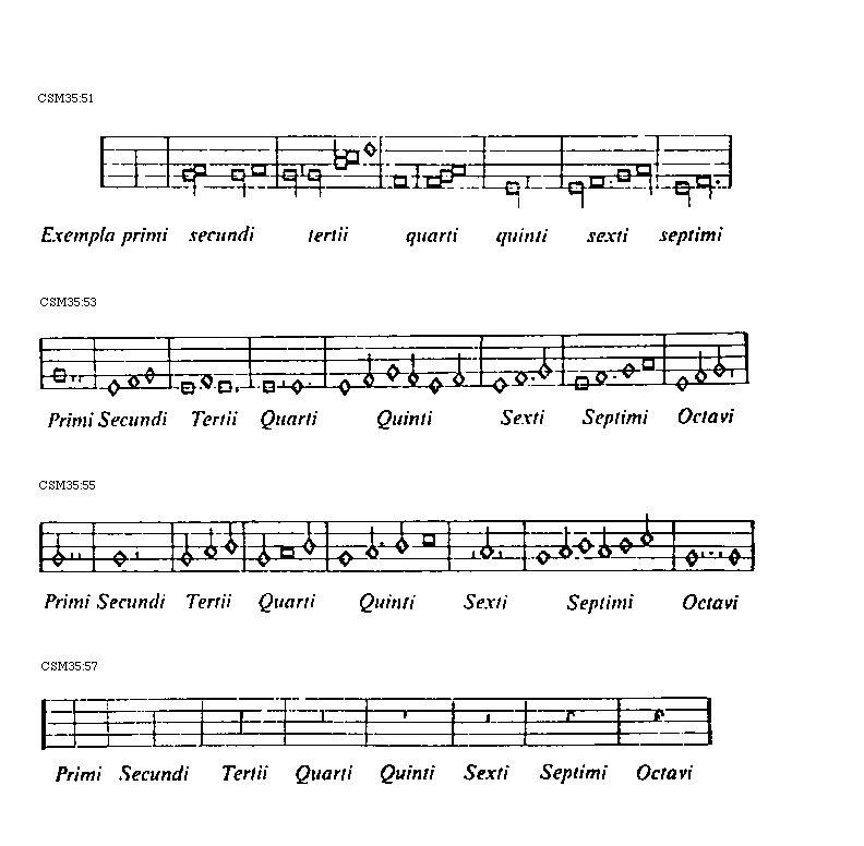 [55]Ulterius sciendum quod cognitio prolationis maioris dupliciter potest haberi, uno modo a priori et hoc per signum quod cantui praeponitur, alio modo a posteriori et hoc contingit octo modis. Primo quum pausae duarum minimarum ordinantur immediate cum una minima. Secundo quum una semibrevis immediate ponitur cum pausa minima. Tertio quum tres minimae simul ordinantur immediate. Quarto quum brevis ponitur inter duas minimas eam imperficientes. Quinto quum duae minimae ponuntur inter duas semibreves habentes inter se punctum divisionis. Sexto quum pausae minimarum habent inter se minimam. Septimo quum tres semibreves cum tribus minimis mixtim ordinantur. 0ctavo quum duae pausae minimarum ponuntur inter duas semibreves, inter quas pausas mediat punctus. Exempla horum habentur per ordinem: