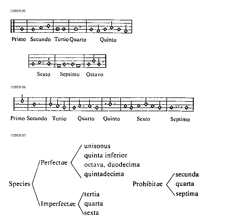 [88]Item semper numeratio notarum pro his speciebus inveniendis semper fit a sursum deorsum, praeter in quarta ut fit sursum. Item nulla species perfecta debet sequi seipsam ut quinta post quintam, nisi de licentia cantorum. Item omnes species perfectae possunt sequi invicem ut quinta post octavam et ceteris. Sed nulla sequitur seipsam nisi in diminutione, ut hic: