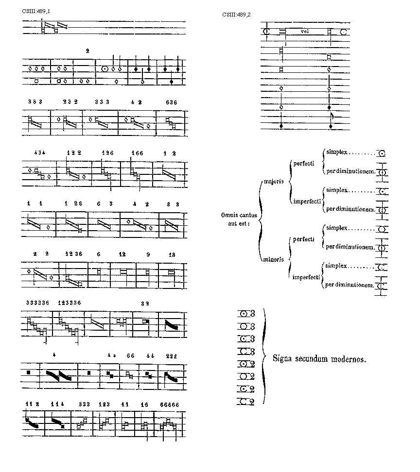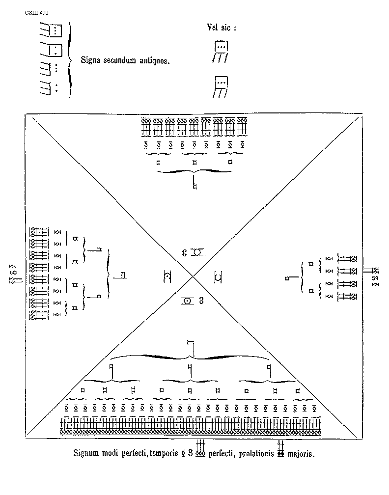 [CSIII:489,2; text: vel, Omnis cantus aut est: majoris, minoris, perfecti, imperfecti, simplex, per diminutionem. Signa secundum modernos.]