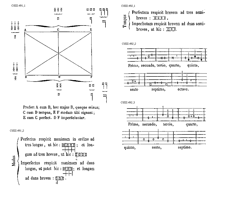 [CSIII:491,2; text: Modus. Perfectus respicit maximam in ordine ad tres longas, ut hic: et longam ad tres breves, ut hic: Imperfectus respicit maximam ad duas longas, ut patet hic: et longam ad duas breves:]