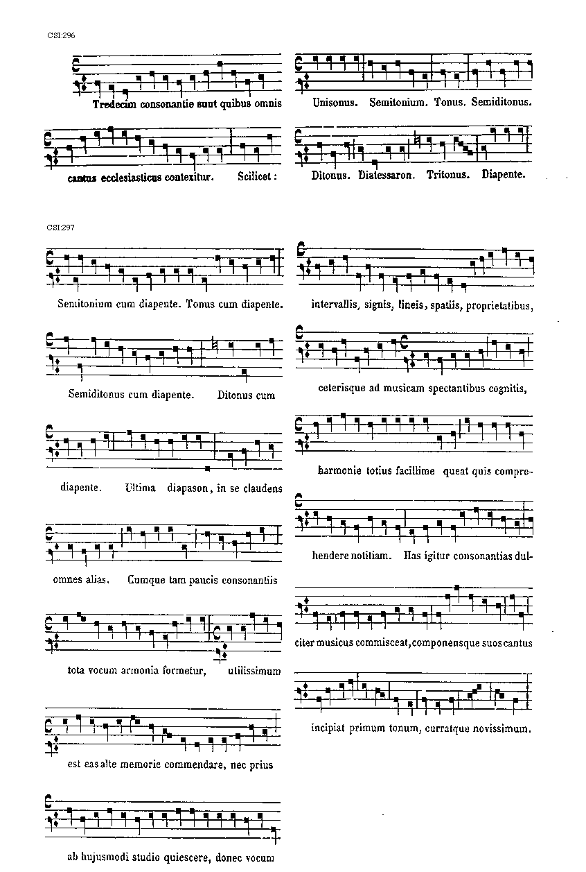 [297][CSI:297; text: Semitonium cum diapente. Tonus cum diapente. Semiditonus cum diapente. Ditonus cum diapente. Ultima diapason, in se claudens omnes alias. Cumque tam paucis consonantiis tota vocum armonia formetur, utilissimum est eas alte memorie commendare, nec prius ab hujusmodi studio quiescere, donec vocum intervallis, signis, lineis, spatiis, proprietatibus, ceterisque ad musicam spectantibus cognitis, harmonie totius facillime queat quis comprehendere notitiam. Has igitur consonantias dulciter musicus commisceat, componensque suos cantus incipiat primum tonum, curratque novissimum.]