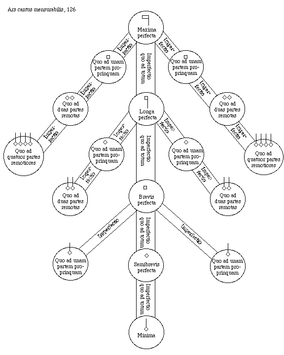 [Ars cantus mensurabilis, 126; text: Maxima perfecta, Longa perfecta, Brevis perfecta, Semibrevis perfecta, Minima, Imperfectio, Imperfectio quo ad totum, Quo ad unam partem propinquam, Quo ad duas partes remotas, Quo ad quatuor partes remotiores]