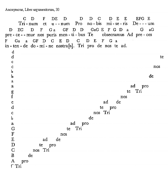 [Anonymous, Liber argumentorum, 30; text: [Gamma], A, B, C, D, E, F, G, a, [sqb], c, d, e, f, g, Trinum et unum Pro nobis miseris Deum precemur nos puris mentibus Te obsecramus Ad preces intende domi-ne nostra[s]. Tri pro de nos te ad.]