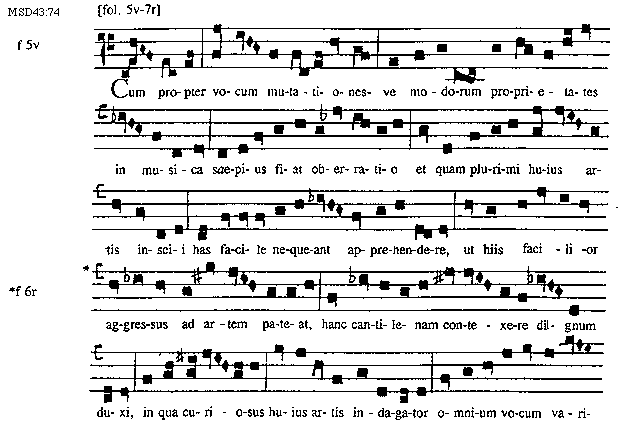 [MSD43:74; text: [fol. 5v-7r], f 5v, Cum propter vocum mutationesve modorum proprietates in musica saepius fiat oberratio et quam plurimi huius artis inscii has facile nequeant apprehendere, f 6r, ut hiis facilior aggressus ad artem pateat, hanc cantilenam contexere dignum duxi, in qua curiosus huius artis indagator omnium vocum varietates]
